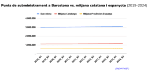 Al contrari del que passa amb el consum elèctric, el nombre de punts de subministrament elèctric a Barcelona reflecteix un creixement sostingut en els últims 5 anys, passant de 2,98 milions el 2019 a 3,08 milions de contractes actius el 2024. En termes comparatius, Barcelona concentra el 67% dels punts de subministrament de Catalunya i representa més del 10% dels punts a nivell nacional. Aquest creixement no només reflecteix la progressiva electrificació de llars i empreses i el dinamisme de la xarxa de distribució, sinó que també posa de manifest l’expansió de la infraestructura, que prepara la província per afrontar amb solidesa els reptes de la transició energètica.