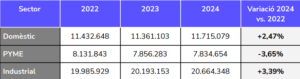 Les dades de 2022 a 2024 reflecteixen un comportament desigual entre els diferents sectors:- Domèstic: consum estable amb lleugera pujada (+2,47%), la qual cosa reflecteix tant l’estabilitat del consum a les llars com una progressiva electrificació vinculada a l’ús d’electrodomèstics eficients. A més, és la segona comunitat autònoma amb major consum domèstic a Espanya, només per darrere d’Andalusia.