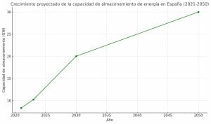 A continuación, presentamos un gráfico que refleja la evolución real y las proyecciones de la capacidad de almacenamiento de energía en España entre 2021 y 2050, basadas en datos de la Estrategia Nacional de Almacenamiento de Energía y otros proyectos en curso.